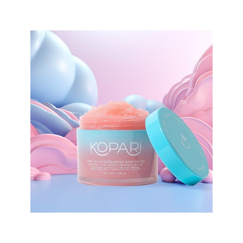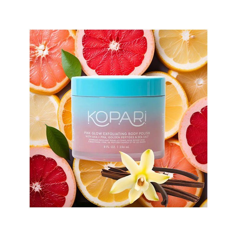 Kopari Pink Glow peeling złuszczający do ciała zawierający kwasy AHA, PHA i peptydy, które poprawiają koloryt i teksturę, pozostawiając promienną i zdrową skórę. Poprawia jej ujędrnienie. Ten delikatny peeling nasycony jest zapachem grejpfruta z nutami jasnej pomarańczy i słodkiej wanilii, aby przenieść Cię do raju prosto spod prysznica.